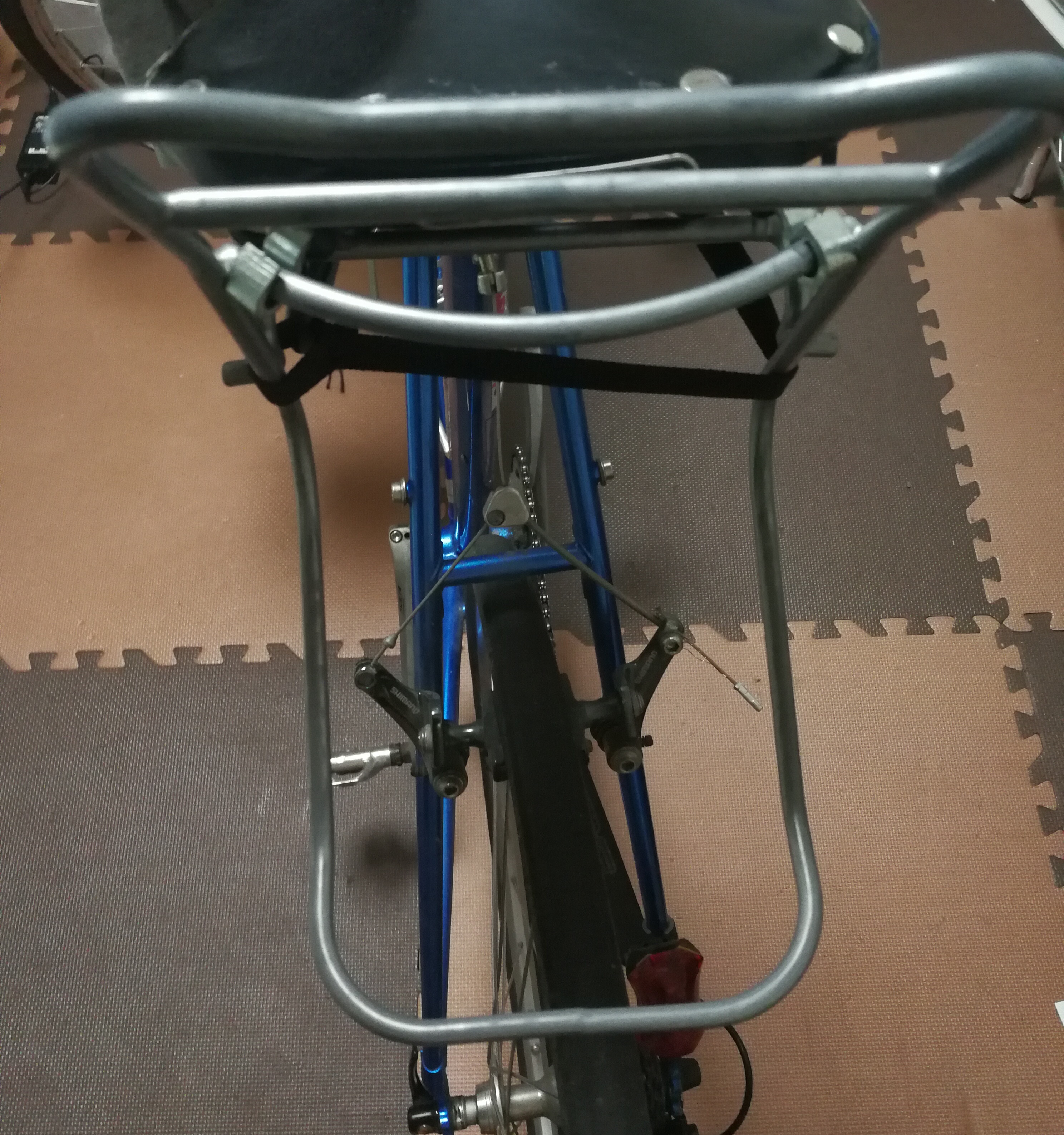 そこで新たにクラシックサドルラックというものを導入しました。これならブレーキワイヤーと干渉せずに、リアに巨大なサドルバッグを搭載できます。このラックは300gと重いですが、荷物の安定性が格段に改善するし、輪行袋や空気入れなどゴムバンドで縛ればなんでも搭載できる利便性があります。さらに工具なしでワンタッチで取り外しできるので、輪行時も非常に便利です。バッグはアマゾンで1590円で入手できる完全防水バッグ10Lで、横向きに搭載しています。