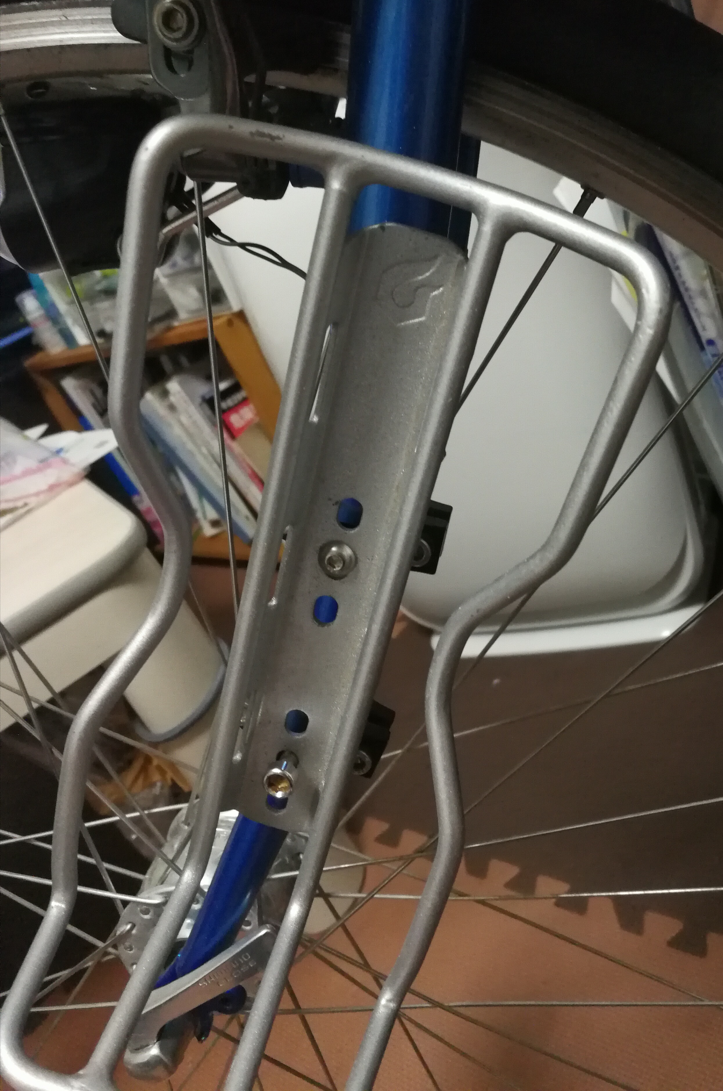 三陸ツーリングでは積載力を高めるためにフロントフォークにもカーゴケージを搭載しました。フロントフォークにはダボ穴がなかったので、チューブスのアダプタで取り付けています。フロントフォークに搭載したカーゴケージも輪行時に取り外す必要がないので、使い勝手が良いです。