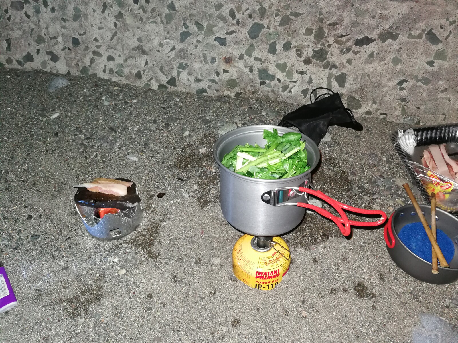スーパーで半額の肉を買いあさり、バーベキューをしようとしたらフライパンがない・・仕方がないので適当な石で肉を焼くはめに。