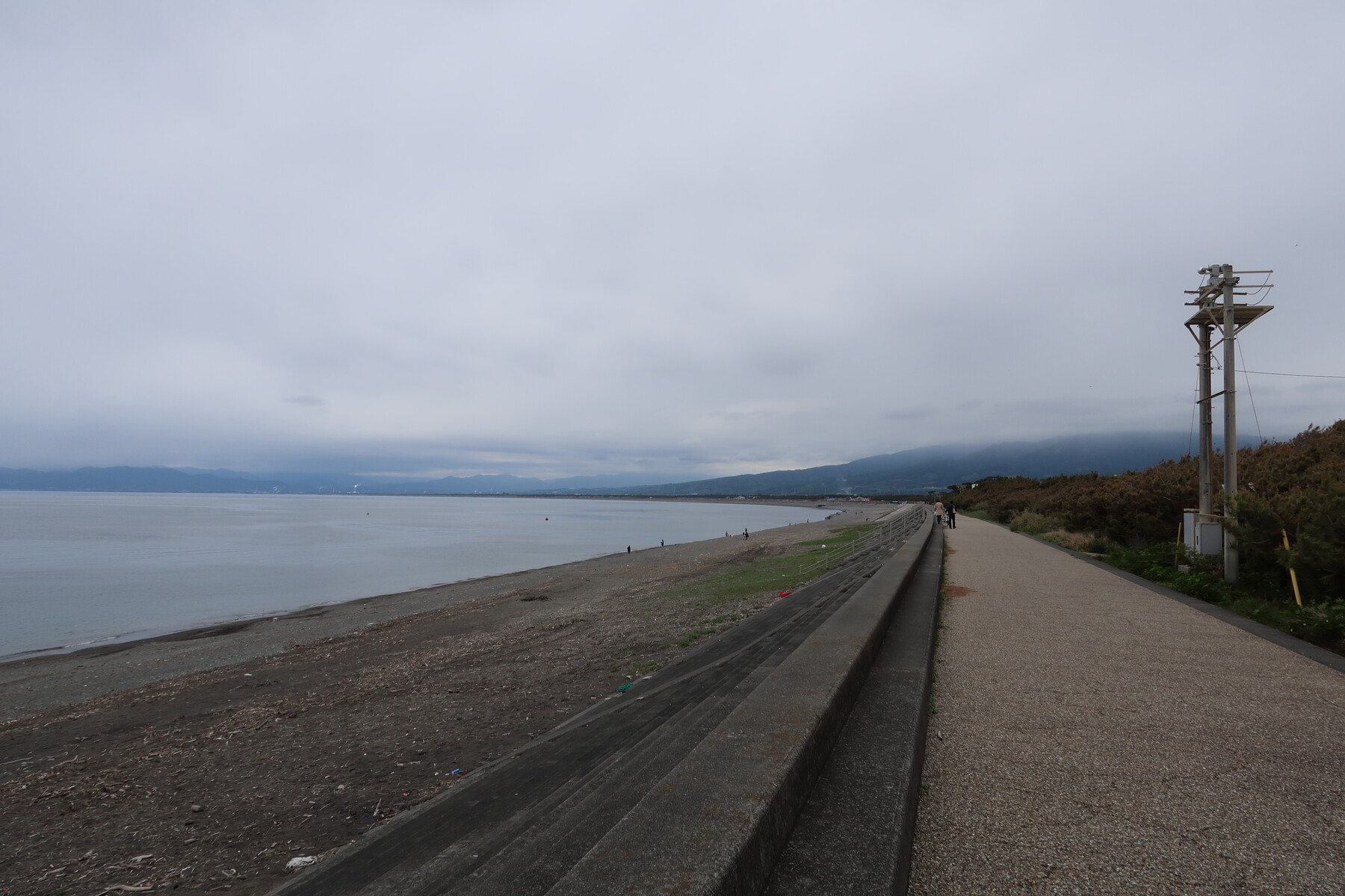 伊豆半島を脱出し、沼津市に入ります。ここからはひたすら平坦な海岸沿いを走ります。ここは自転車専用道ではありませんが、砂の堆積などなく非常に快適です。右手に富士山、左手に駿河湾と伊豆半島を見渡せる最高の道です。晴れていれば・・