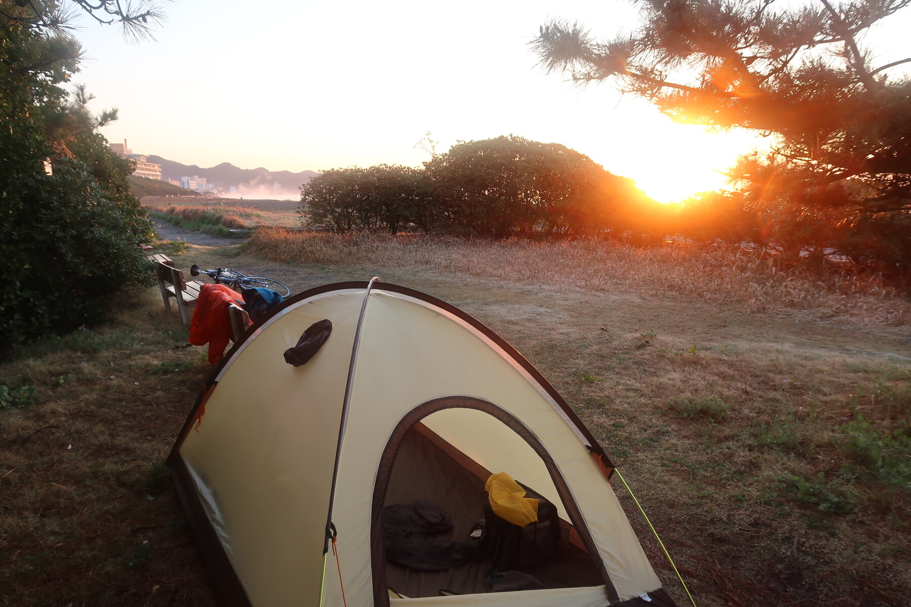 熱海は観光客でいっぱいでした。カップルの冷たい視線を感じながら海岸沿いにテントを張ります。
