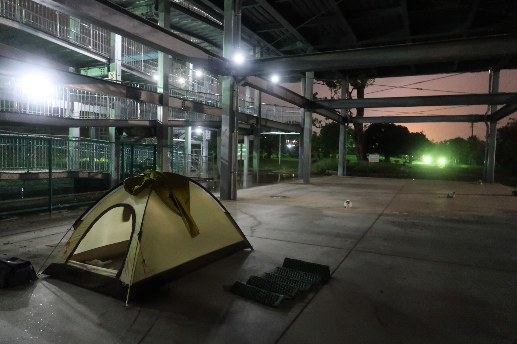自転車道沿いの、三保ふれあい広場でキャンプです。野良猫親子がやってきました。